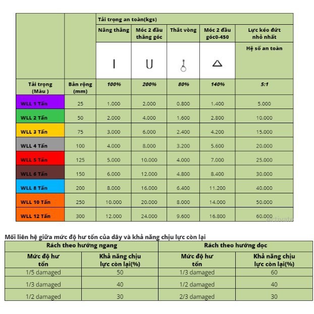 - Ví dụ cáp vải 1 tấn móc thẳng thì cẩu được tải trọng cho phép 1 tấn