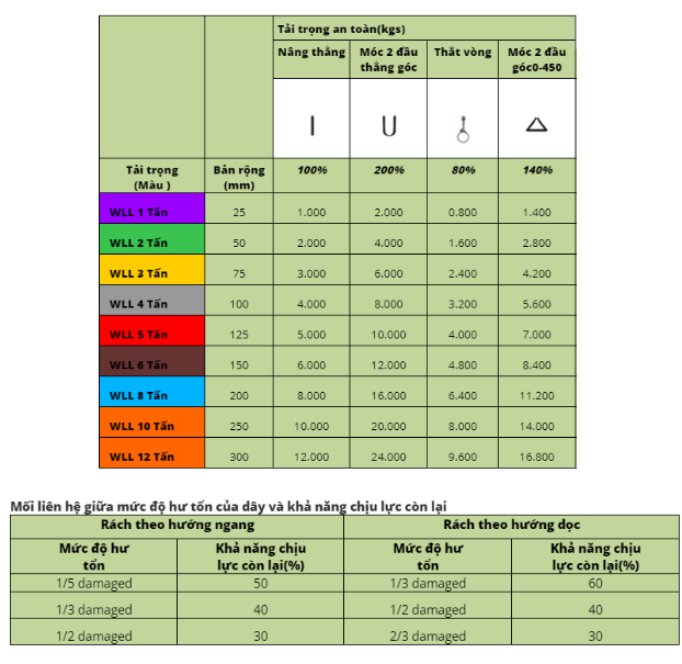 - Mỗi 2,5cm bản rộng của dây tương đương 1 tấn tải trọng.