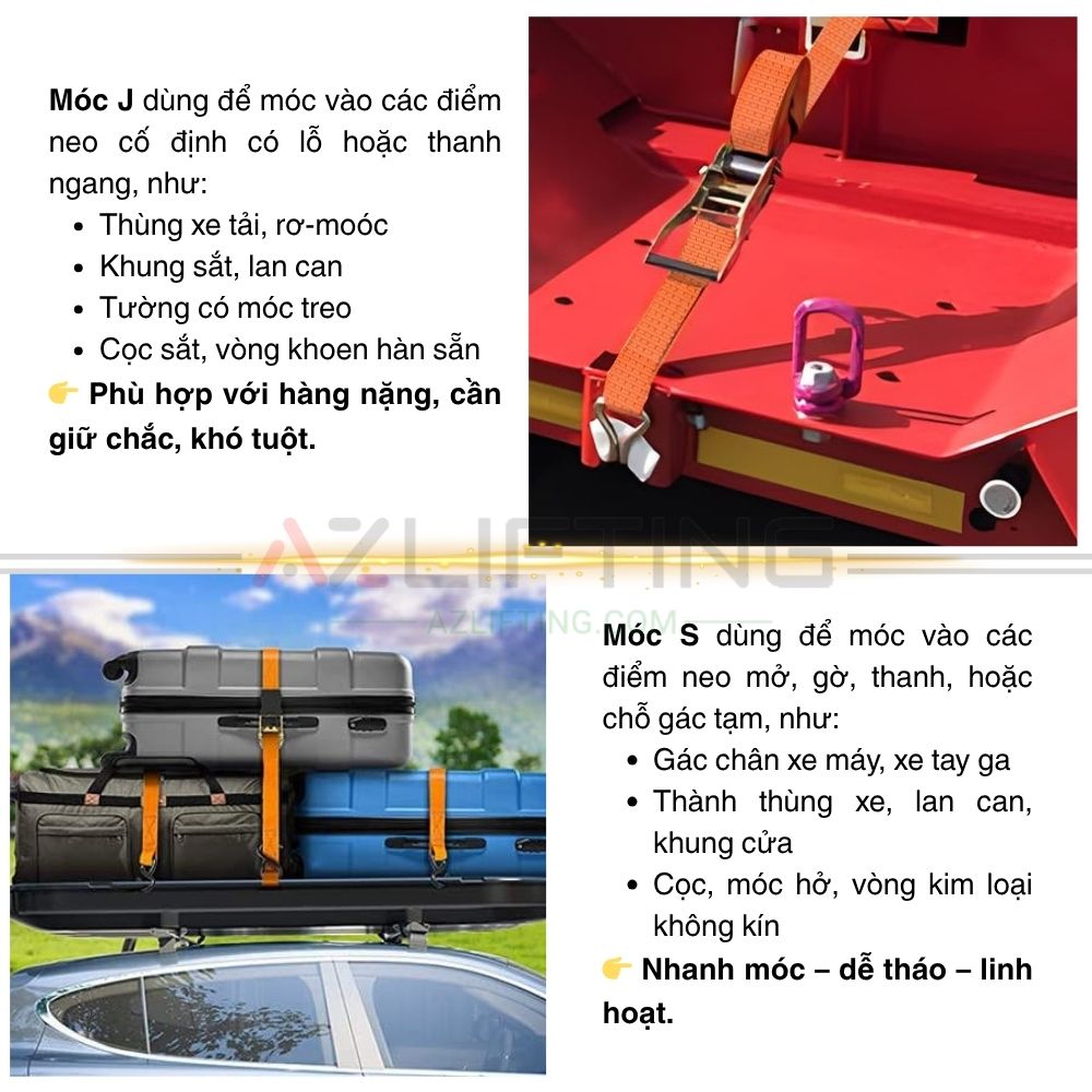 Dây chằng hàng là thiết bị không thể thiếu trong vận chuyển và cố định hàng hóa. Tuy nhiên, không phải ai cũng hiểu rõ sự khác biệt giữa móc S và móc J – hai loại đầu móc phổ biến nhất hiện nay. Bài viết dưới đây sẽ giúp bạn so sánh chi tiết và lựa chọn đúng loại dây phù hợp với nhu cầu.