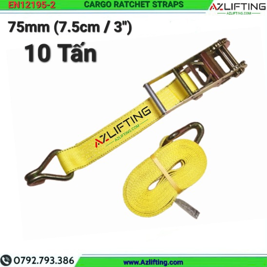 Dây chằng tăng đơ bản 75mm (7.5cm hoặc 3 inch) là dòng dây polyester bản lớn, kết hợp tăng đơ và móc chịu lực, chuyên dùng để buộc chặt hàng hóa tải trọng lớn.