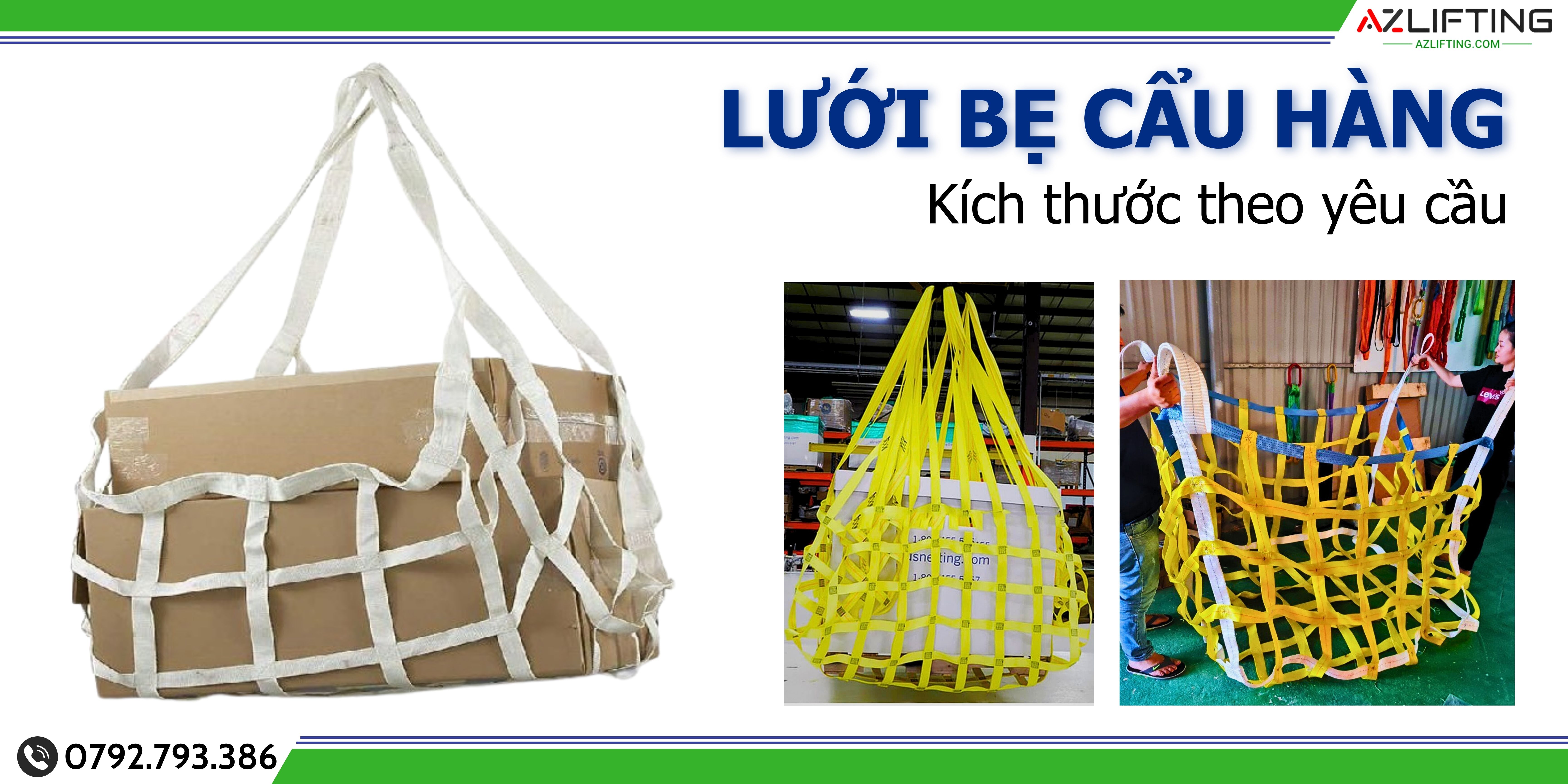 Lưới bẹ dây đai cẩu hàng bền bỉ, an toàn, chịu tải 1–5 tấn, linh hoạt theo yêu cầu. Giúp nâng hạ hàng hóa, thiết bị dễ dàng tại xưởng, kho, gia đình. Liên hệ AZLifting