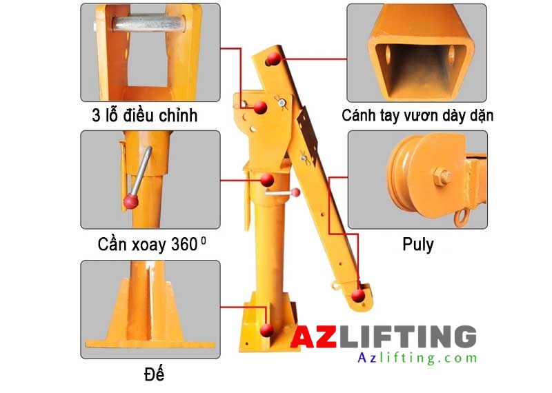 Khung cẩu xoay ô tô mini này thường kết hợp với tời ắc quy, tời quay tay, tời điện các dòng PA, KCD có trọng tải từ 500kg đổ xuống để xếp dỡ vật nặng, hàng hóa trên xe tải tại các nhà kho, bến cảng, nhà xuởng...