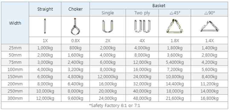 - Dây cáp vải cẩu hàng Hàn quốc 6:1 được làm từ vật liệu Polyester có đặc tính: Không hút ẩm, chịu nước, chịu dầu, không bị nấm mốc hay vi khuẩn ăn; chịu lực tốt, không co giãn, có độ bền cao
