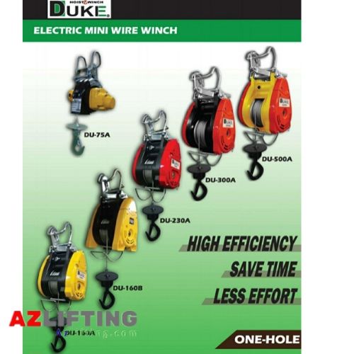 TỜI ĐIỆN TREO DUKE là một thiết bị hỗ trợ nâng hạ hàng hóa xuất xứ từ Đài Loan. Máy có tính năng thông minh, thiết kế hiện đại và chất lượng cao cấp, được sử dụng rộng rãi trên hầu khắp các lĩnh vực như công trình xây dựng, kỹ thuật dân dụng, nhà máy, kho bãi, nhà ở, dùng trong nông nghiệp và thủy sản,…. TỜI ĐIỆN TREO DUKE 160kg được thiết kế đặc trưng để nâng hạ hoặc kéo hàng hóa theo phương thẳng đứng. Ưu điểm vượt trội của máy là tốc độ nâng hạ nhanh chóng.